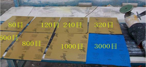 (4) 接著使用[中]400#、800#、[精]1000#、2000#、3000#等砂紙逐級打磨,可加“C-1#液”助磨。