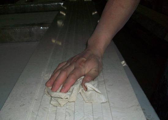 2 將加光蠟均勻涂覆在產品表面,形成薄薄一層蠟。放置2~3分鐘之后用1#鋼絲棉將表面蠟完全擦干凈。