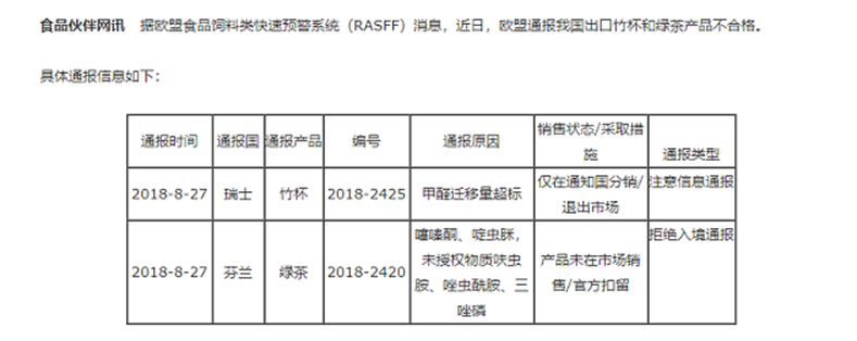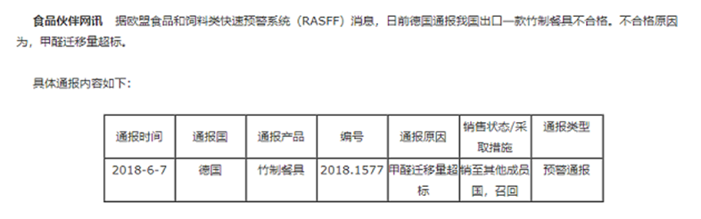 近期,一批中國浙江產竹纖維餐具因存在化學危害風險遭到歐盟(RASFF)通報,通報稱該批出口斯洛伐克的竹纖維碗,被發現甲醛遷移指標不合格的問題,不符合歐盟塑料食品接觸材料法規(EU)No10/2011的要求。目前被通報產品已被進口商作下架處理。