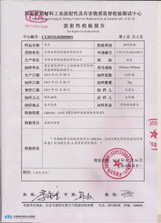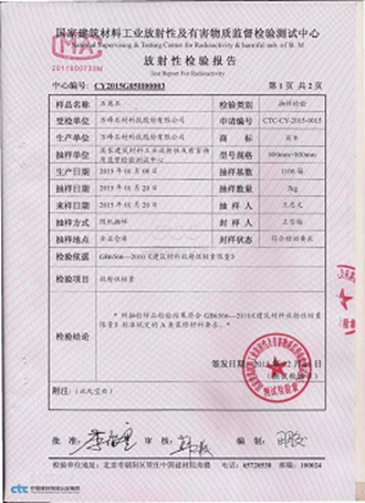 公司原材料進廠及產成品經過放射性檢驗,符合A級標準。經國家級質量監督檢驗機構的檢測,我司產品完全符合放射性A類標準。附:國家級檢測機構的檢測報告。