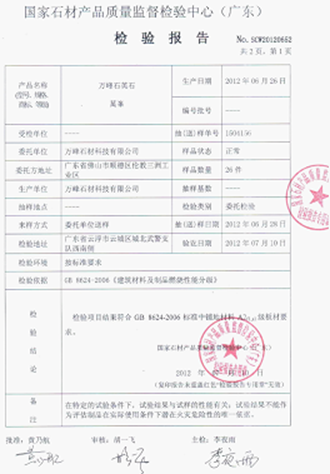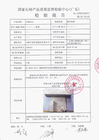 經國家石材產品質量監督檢驗中心檢測,防火性能達到A級要求。附:國家級檢測機構的檢測報告。