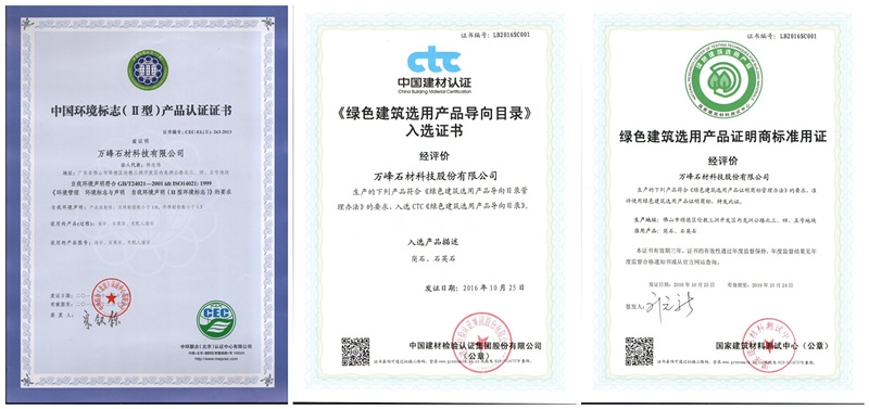 一直以來,萬峰石材不斷地發(fā)展生態(tài)環(huán)保事業(yè),堅持自主研發(fā)“低能耗、低污染、低排放”符合資源綜合利用的“三低”循環(huán)經(jīng)濟(jì)新型生態(tài)建材,并且斬獲了收獲許多的獎項。