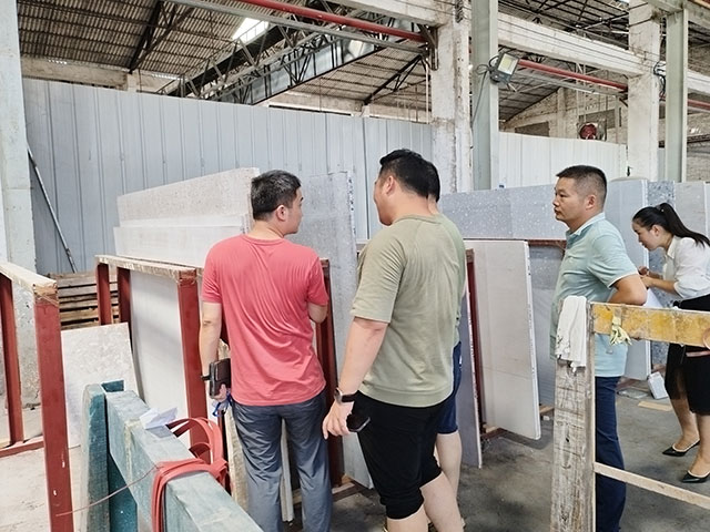 7月21日,上海萬科地產(chǎn)項(xiàng)目組人員到萬峰石材生產(chǎn)基地進(jìn)行驗(yàn)板工作。